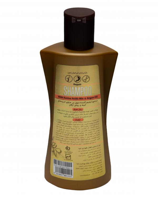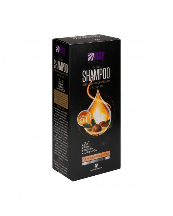 شامپو روغن آرگان BIZ ترمیمکنندۀ موهای به شدت آسیبدیده افزایش سرعت رشد مو (Argenine) حفظ رطوبت مو (Sodium PCA) غنی شده با ویتامین B5 درخشندگی و لطافت مو پیشگیری از خشکی مو و کاهش التهاب پوستی 300 میلیلیتر شامپو ترمیمکنندۀ موی سر حاوی اسید آمینه و روغن آرگان